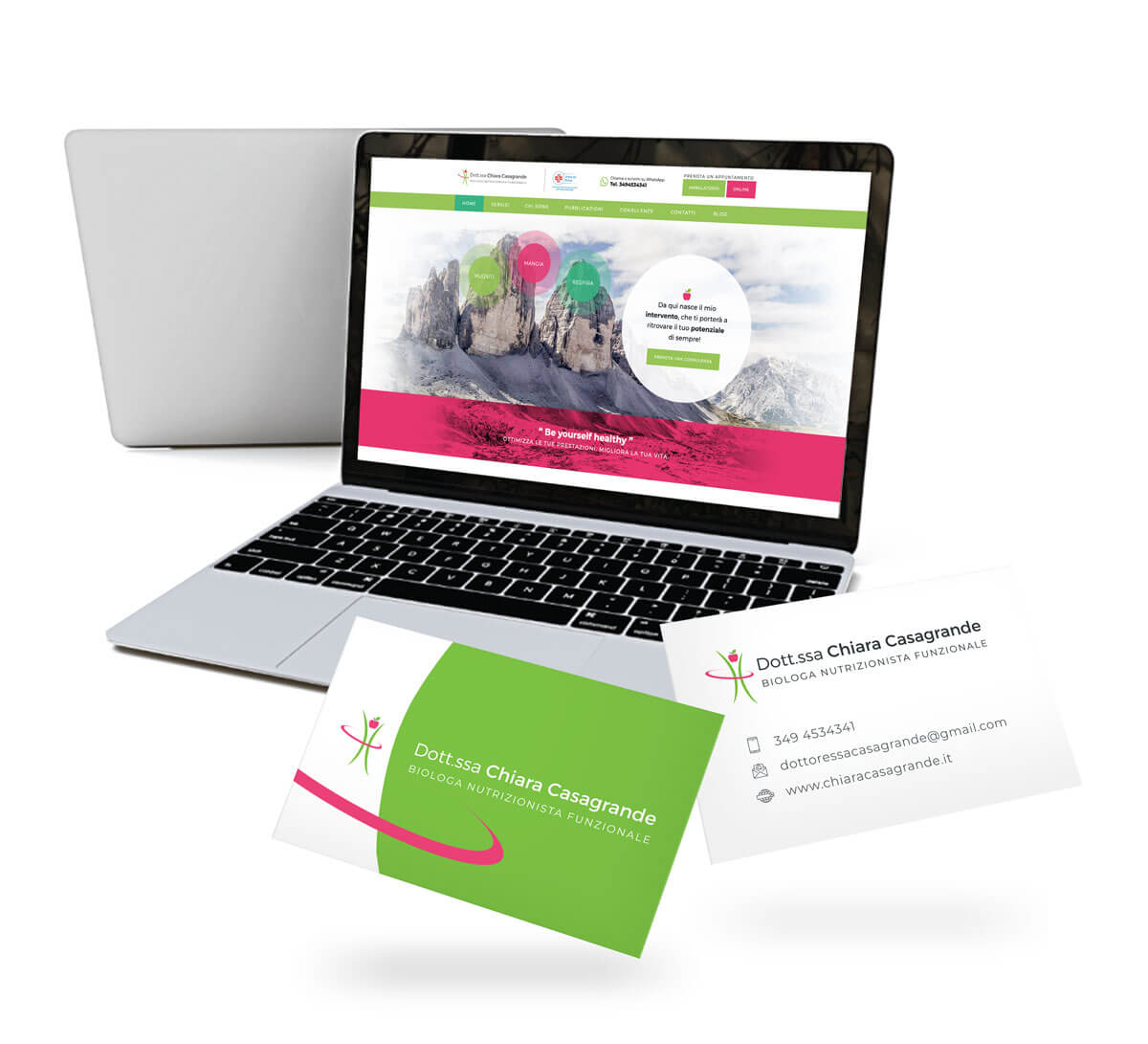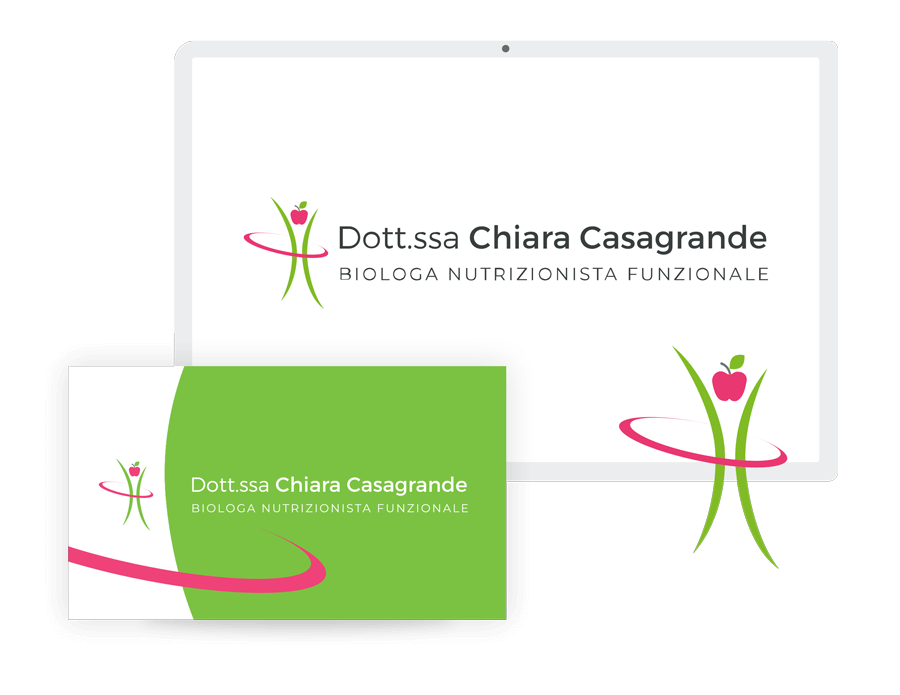 La Dottoressa Chiara Casagrande è una biologa nutrizionista funzionale e la sua richiesta era un logo che comunicasse i valori di “salute”, “sana alimentazione”, “attività fisa” e soprattutto professionalità. Ho disegnato il marchio tenendo ben presente questi valori. La mela, simbolo per eccellenza della buona salute, si fonde armoniosa con le altre linee che richiamano lo slancio fisico di una persona sana e a proprio agio nel proprio corpo. Il biglietto da visita riprende linee e colori, mantenendo una grafica semplice e diretta che comunica affidabilità. I colori usati sono il verde e il rosa, salute e forza.
