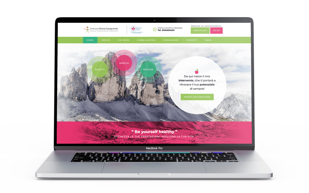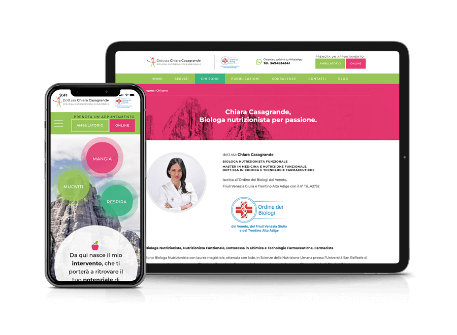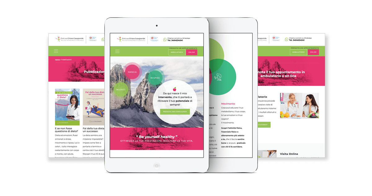 Lo step successivo una volta delineata l’immagine e la linea grafica da seguire, è la realizzazione del sito vetrina. Chiara ha molto da dire e diversi contenuti che vanno esposti in maniera chiara e organizzata nelle varie sezioni. Il design riprende i colori del brand mantenendo un tocco femminile e personale che avvicina l’utente alla “dottoressa”. In homepage sono presenti tutte le principali informazioni utili che poi verranno approfondite nelle pagine dedicate. Il sito naturalmente è responsive e si adatta ad essere facilmente consultabile su tutti i principali dispositivi.