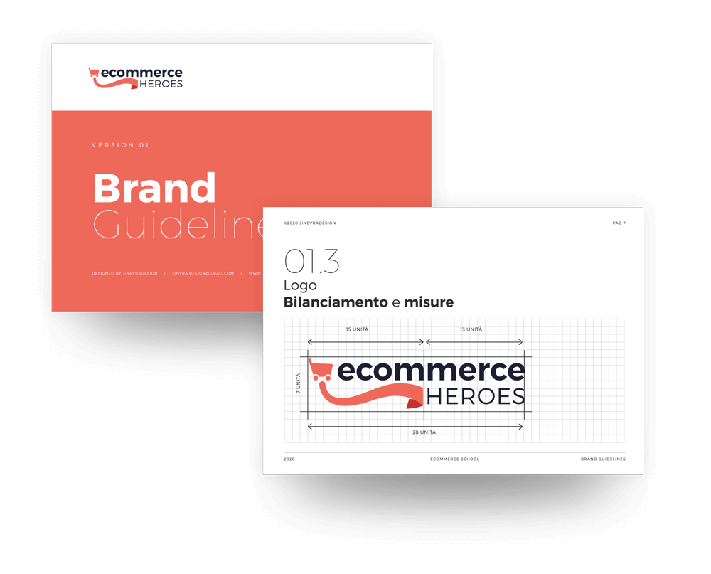 Il logo per Ecommerce Heroes è stato studiato per essere connesso al logo dell’azienda madre “Ecommerce School”. Ho ripreso come elemento identificativo il carrello che nel caso di ecommerce school viene abbinato ad un cappello da laureando. In questo caso invece, il carrello diventa quasi il nodo di una cravatta, simbolo dell’imprenditore e del manager ma soprattutto elemento distintivo del nostro eroe mascotte. Il Manual brand spiega come utilizzare il logo in tutte le sue declinazioni e come impostare una brand identity coerente.