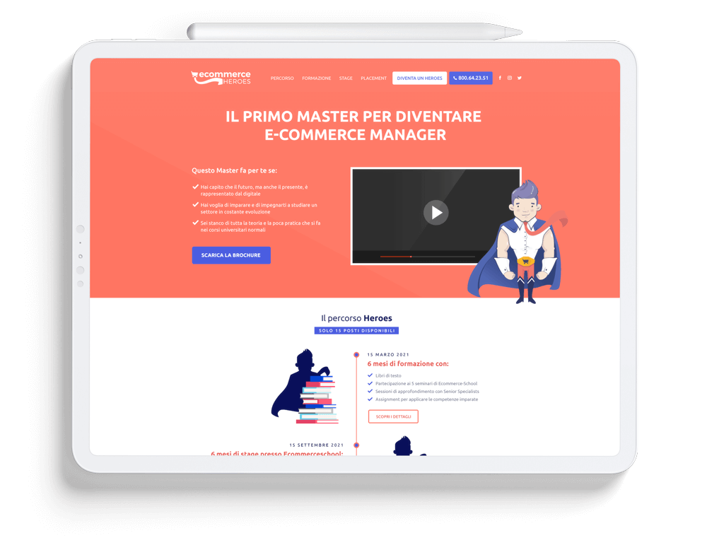 Marco Biasin, imprenditore del settore ecommerce, si è rivolto a me per creare un nuovo brand per un master di formazione. Ecommerce Heroes dovrà avere una mascotte che presenti il corso.