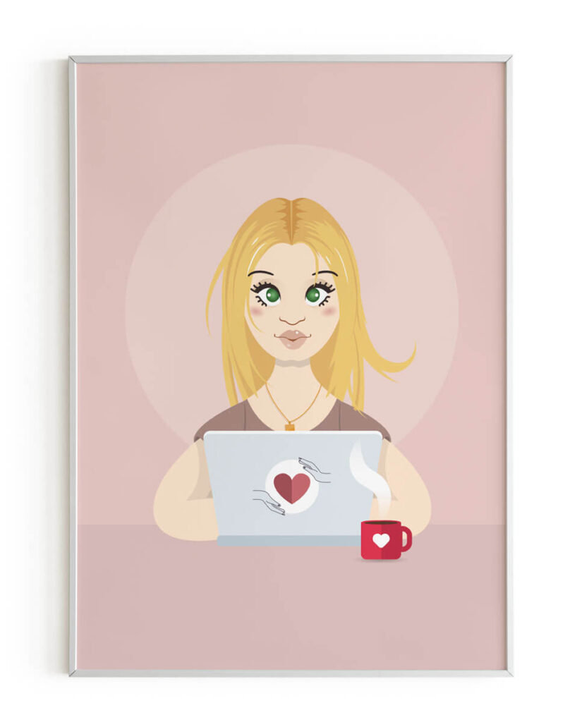 Un personaggio ben disegnato può trasmettere simpatia e fiducia, ma sopratttutto creare una connessione emotiva, elemento essenziale per una professione delicata come quella di Francesca, che spesso incontra numerosi taboo nella promozione online. Per Francesca ho creato un suo alter ego cartoon capace di rendersi facilmente riconoscibile e coinvolgere il pubblico. Il personaggio ha capelli biondi e grandi occhi, quasi un manga, simpatico, sorridente, familiare tanto da scatenare un senso di calore e conforto. Un modo questo non solo di catturare la fiducia degli utenti, ma ancche di incuriosire e rendere uniche le copertine dei suoi libri cartacei e degli ebooks.