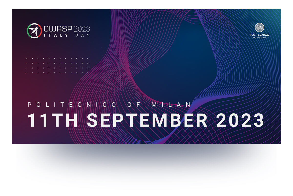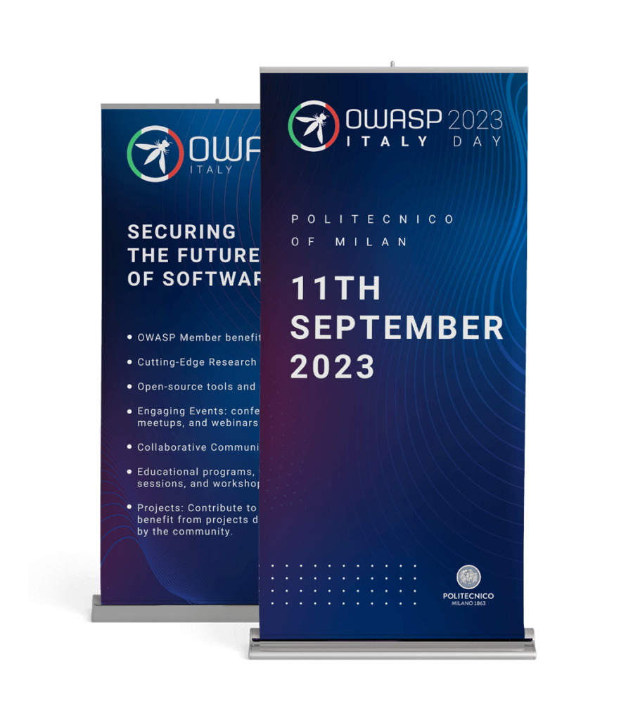 L’immagine dell’evento italiano, l’Owasp 2023 Italy Day, dovrà essere coordinata a quella dell’evento internazionale, seppur distinguendosi. Ho scelto un design lineare e moderno e creato uno sfondo futurista con sfumature dal blu al viola ed elementi astratti che ricordano codici informatici. Autorevolezza e credibilità, queste le parole chiave da tenere presente nella realizzazione del materiale pubblicitario. I Rollup saranno elemento essenziale di presentazione durante il meeting.