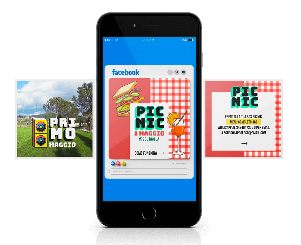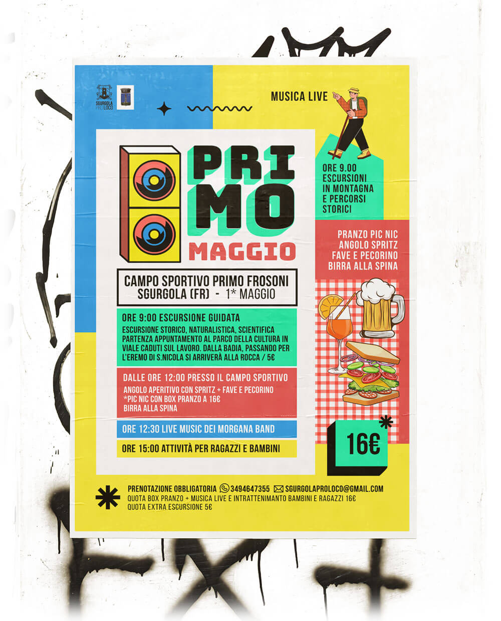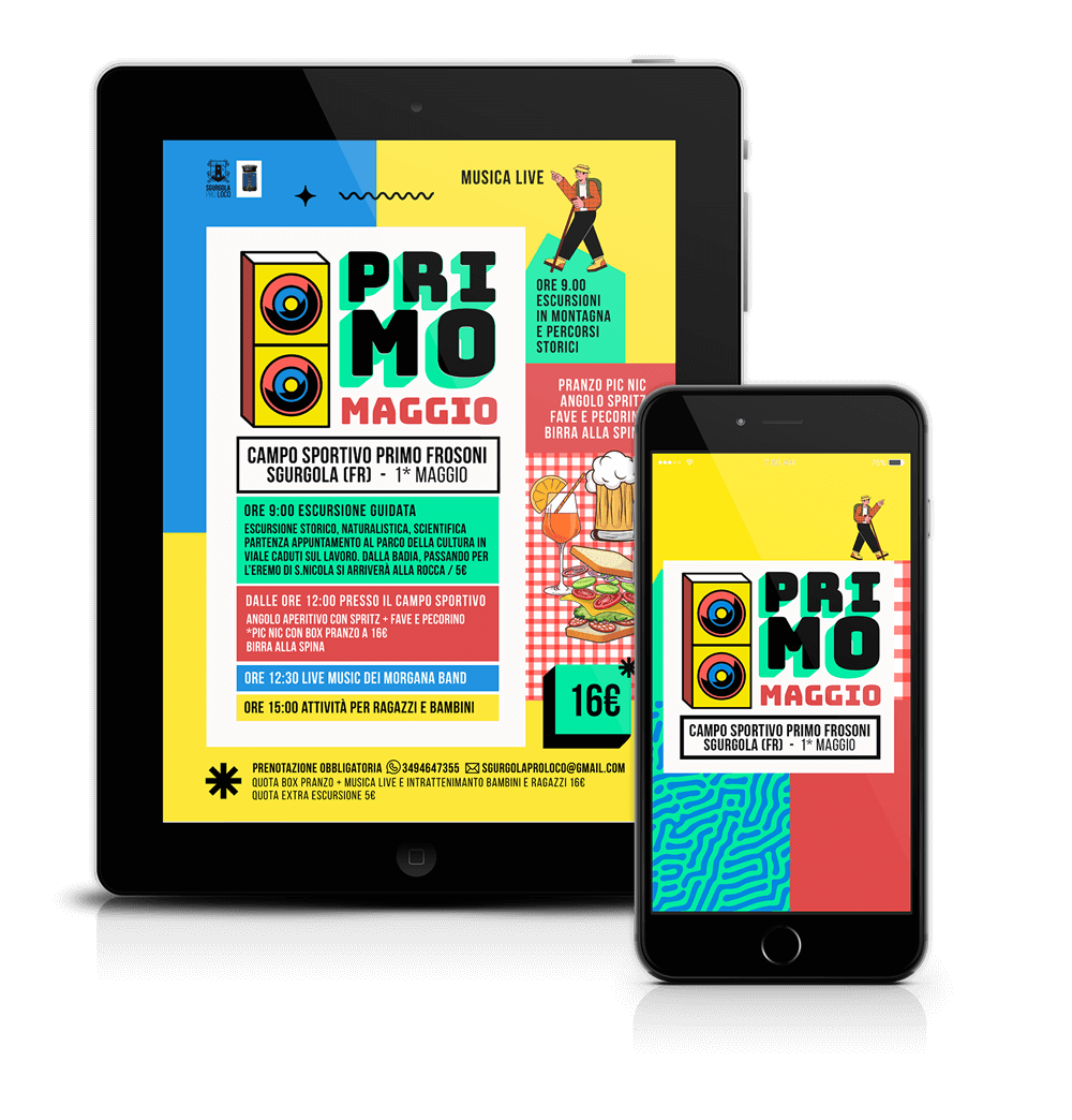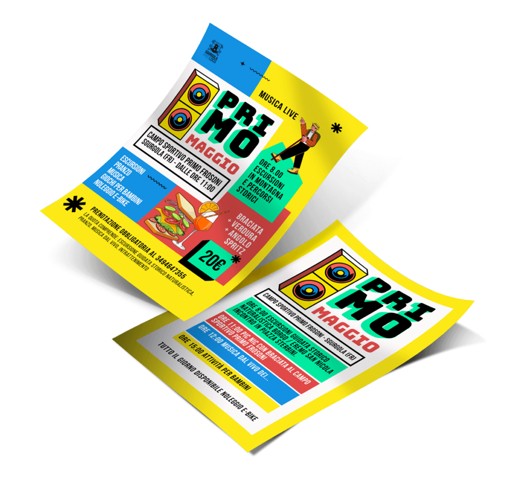 L’Associazione Sgurgola Pro Loco idea eventi che poi diventano format da ripetere negli anni, potenziandone gli aspetti vincenti. Da qui l’esigenza di avere delle grafiche studiate per ogni evento, prendendo in considerazione il target e i valori da comunicare. “Primo Maggio” è un pic nic per ragazzi e giovani famiglie dove fare sport di squadra, sentire musica dal vivo e mangiare insieme. Ho realizzo un’immagine dai colori forti e vibranti, moderna quasi “street” che strizza un po l’occhio al design “MTV” anni 2000. Colori e forme hanno il compito di attirare subito l’attenzione e far subito pensare ad un tipo di evento giovanile e dinamico.